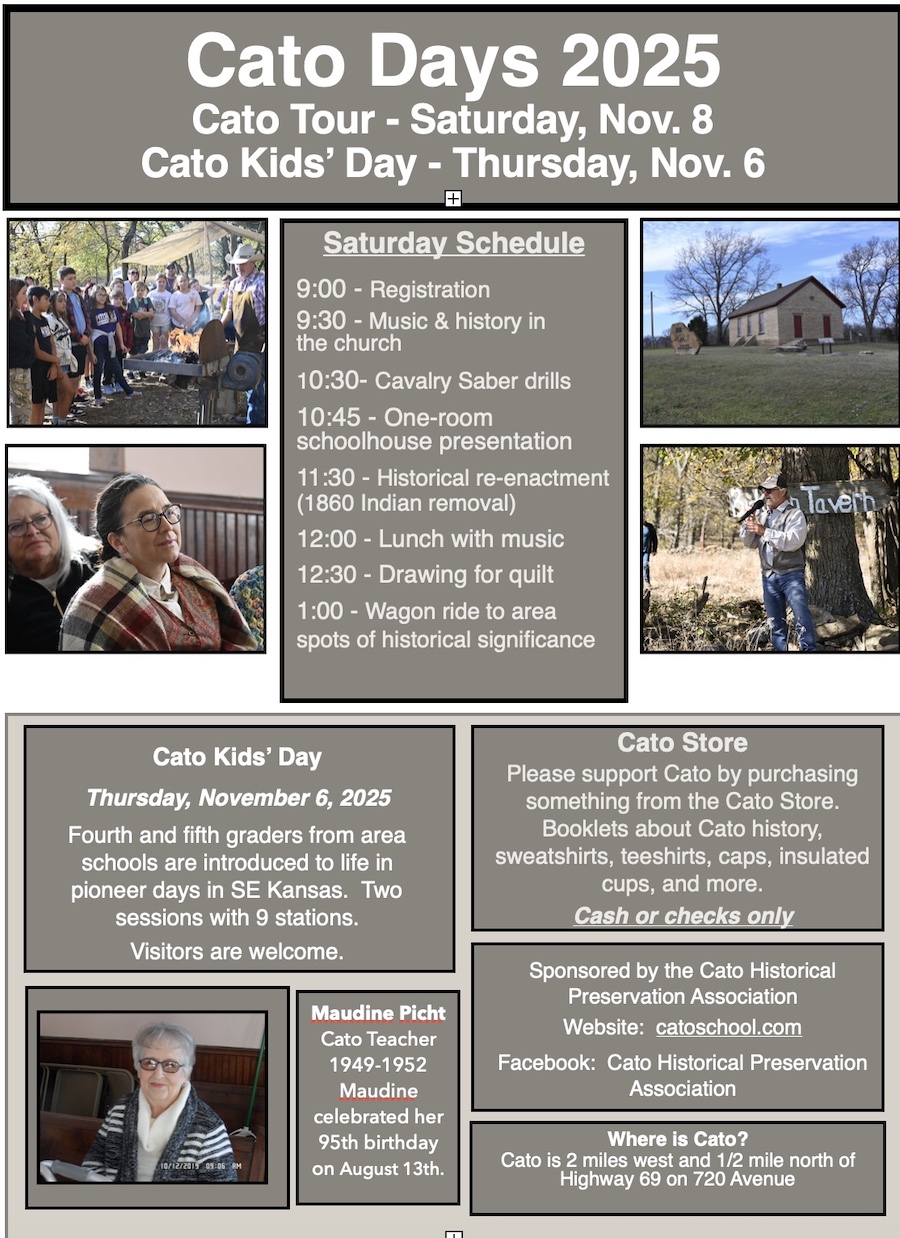 ![]() | Directions to Cato, Kansas On U.S. Hwy 69 between Ft. Scott and Pittsburg, Kansas: Turn west on county Road 720 (One mile north of the Arcadia turn-off, or 1 mile south of the Bourbon County Line) Go west for one mile on 720 Then turn north for 1/2 mile Turn west and proceed 1 mile to your destination, Cato! |